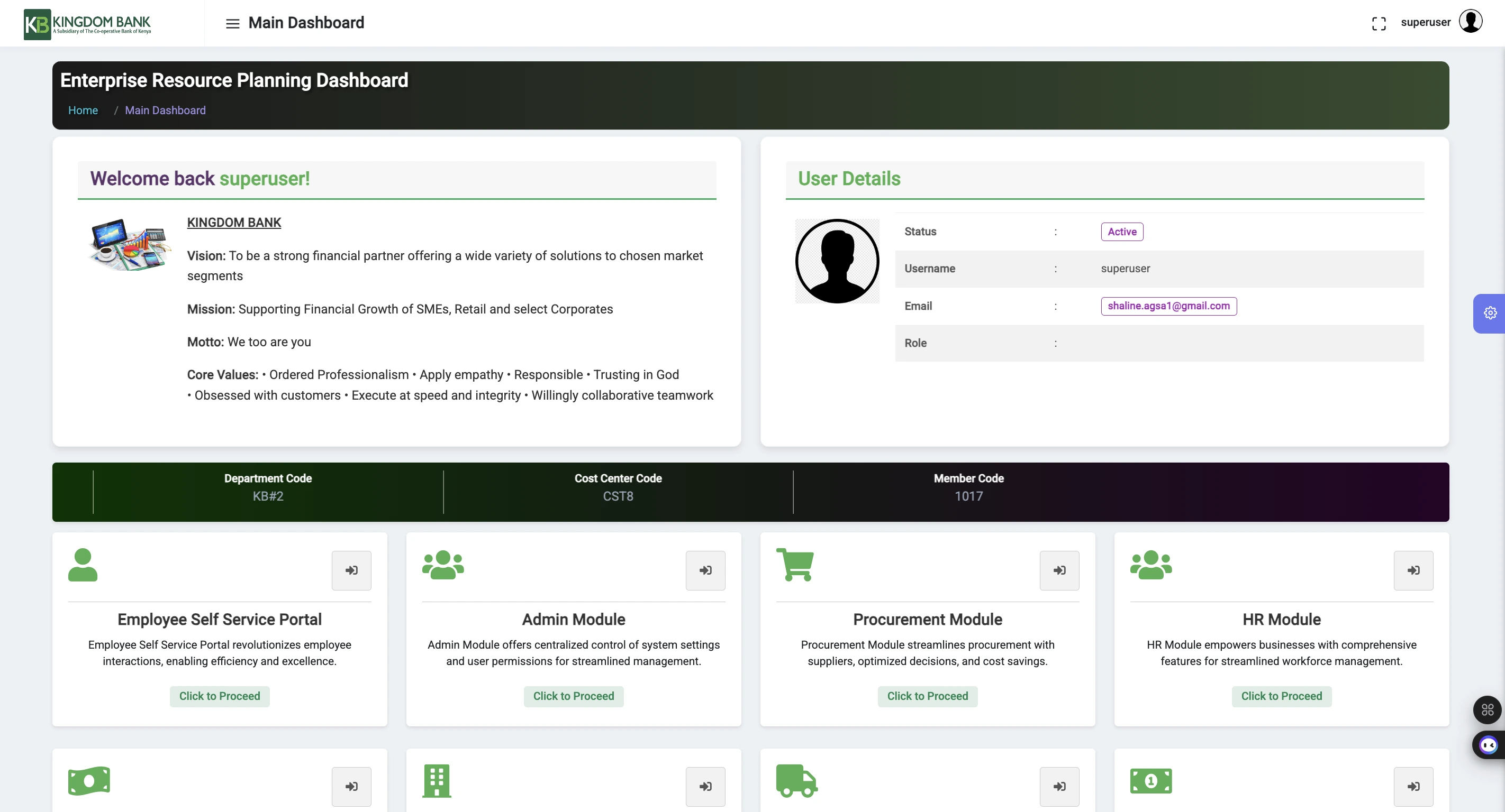Comprehensive ERP system with modules for HR, Finance, Procurement, Inventory, and Asset Management.